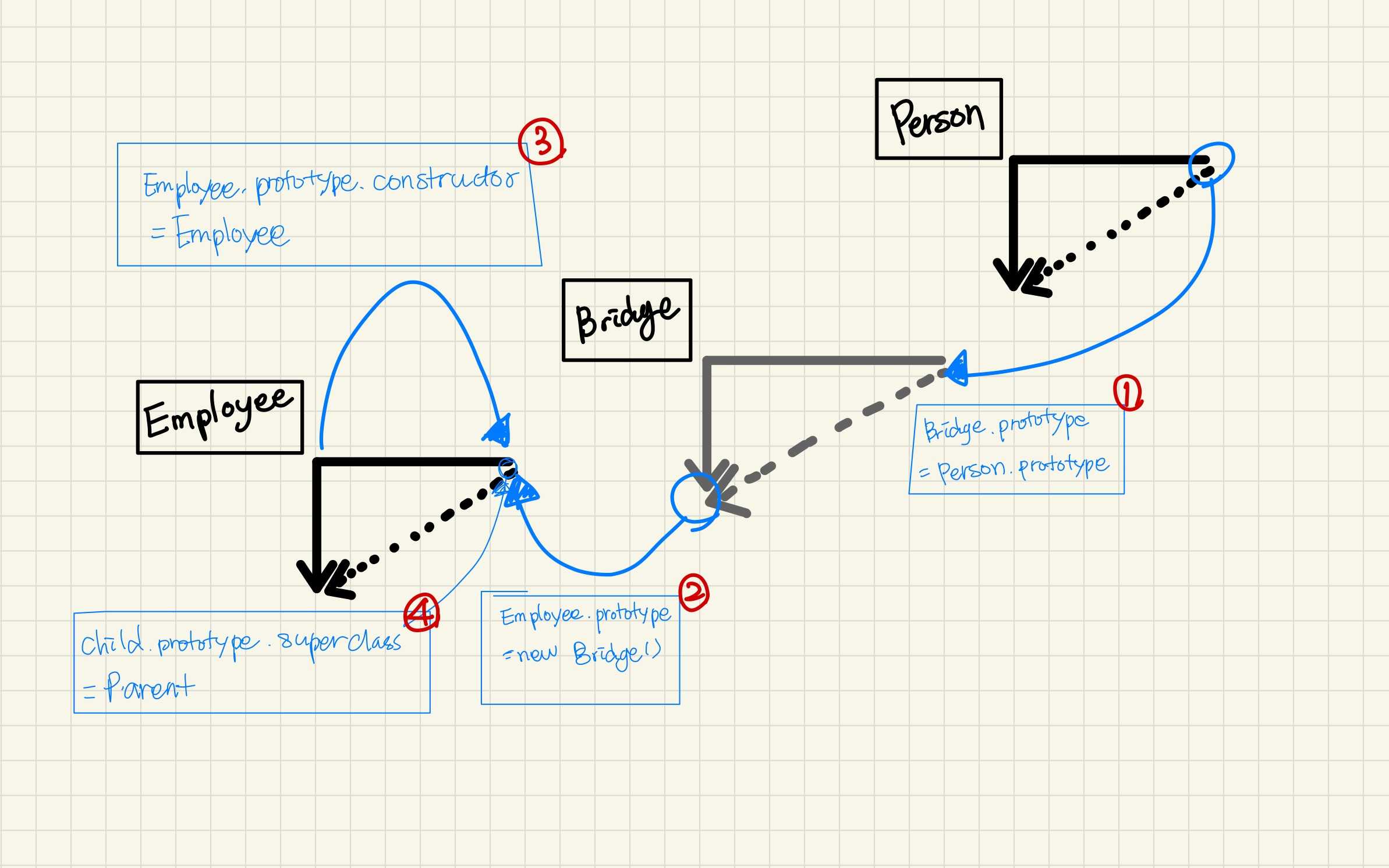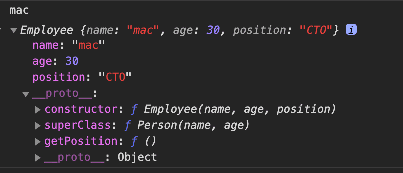 //* es5에서 많이 사용해서 아래와 같이 클래스 상속을 구현 //* 클로저를 생성해서 'Bridge'를 단한번만 사용할 수 있게 함 var extendClass = (function() { function Bridge() {} return function(Parent, Child) { Bridge.prototype = Parent.prorotype //1번 Child.prototype = new Bridge() //2번 Child.prototype.constructor = Child //3번 Child.prototype.superClass = Parent //4번 } })() function Person(name, age) { this.name = name || "홍길동" this.age = age || 0 } Person.prototype.getName = function() { return this.name } Person.prototype.getAge = function() { return this.age } function Employee(name, age, position) { this.superClass(name, age) //4번: 하위 클래스에서 이런 호출로 상위 클래스가 설정한 프로퍼티 세팅 가능 this.position = position || "미정" } extendClass(Person, Employee) Employee.prototype.getPosition = function() { return this.position } var mac = new Employee("mac", 30, "CTO") - 결과