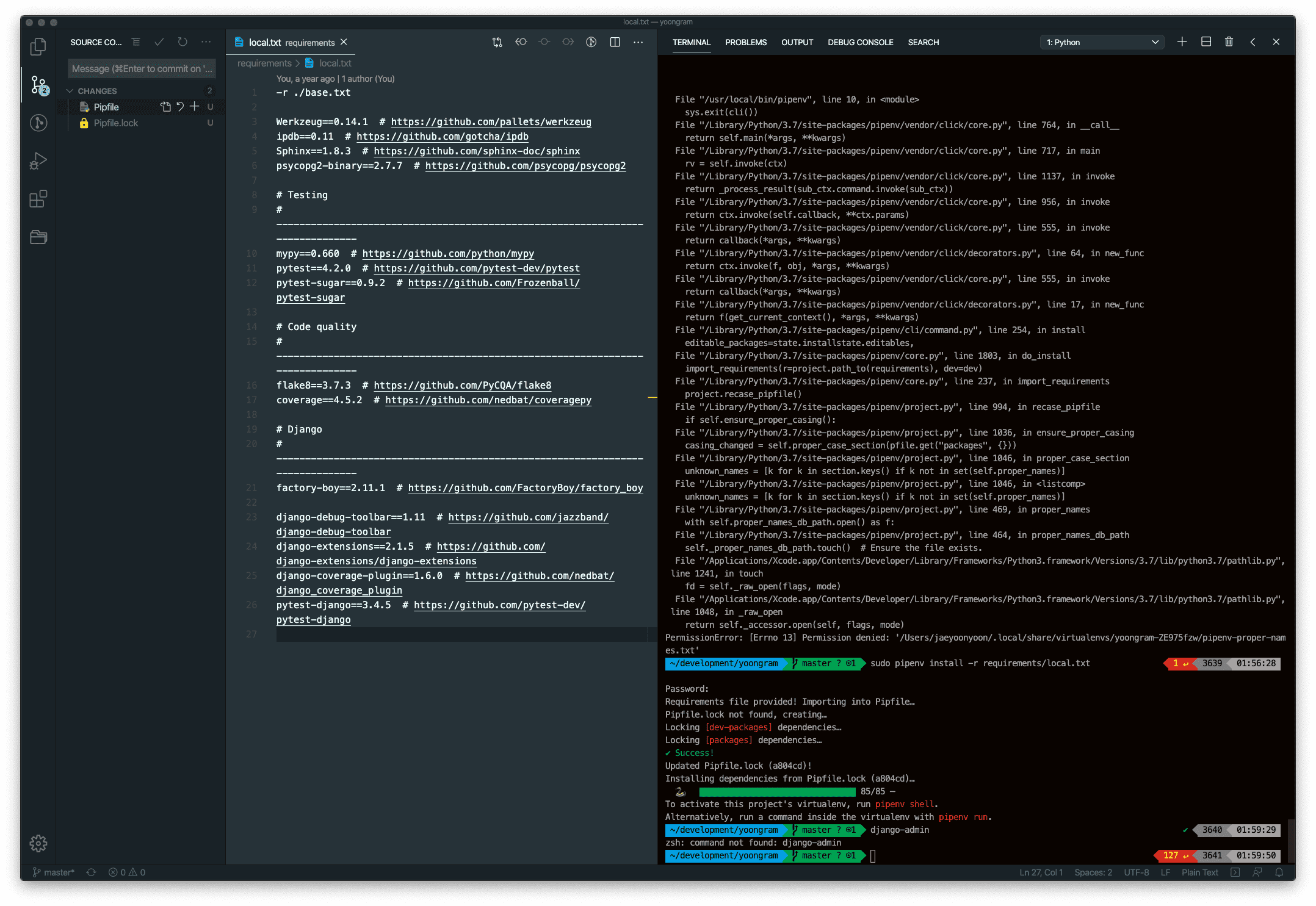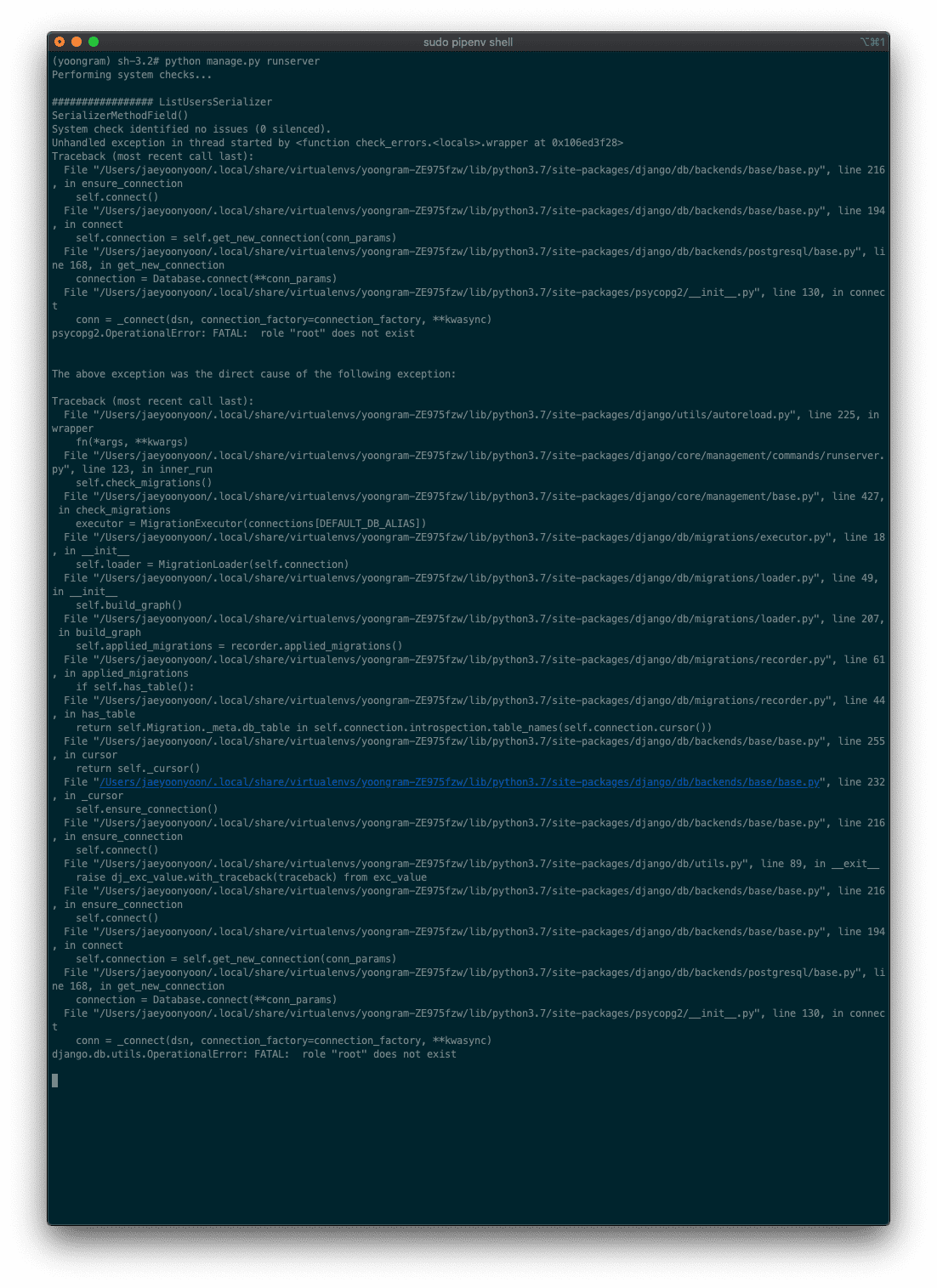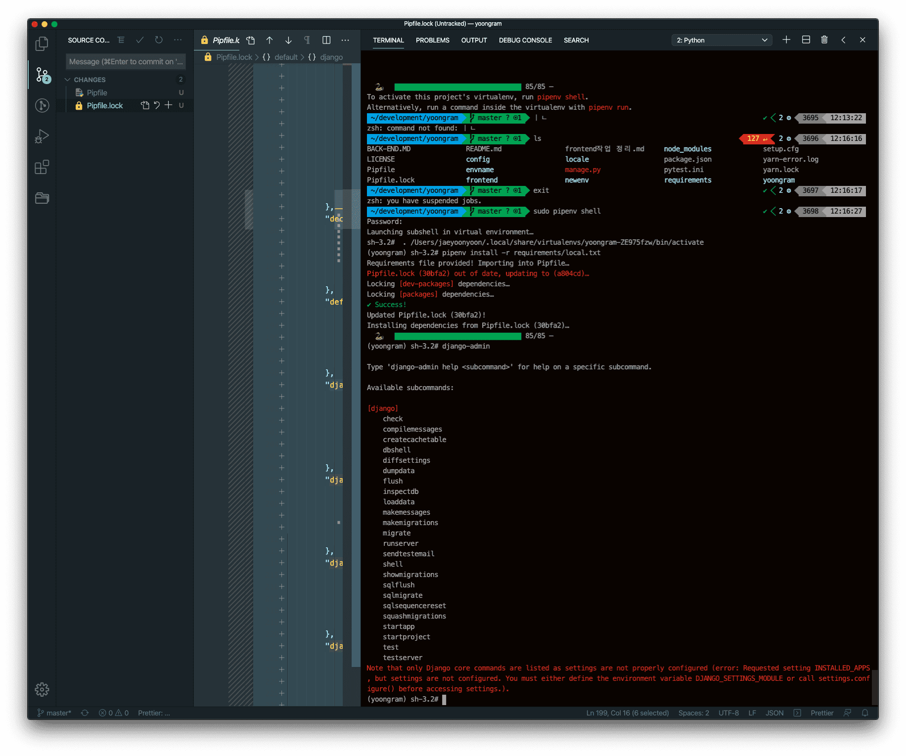 sudo pipenv shell → terminal이 sh-3.2# 으로 변경됨... 백그라운드에서 뭔가 작업하는줄알고 취소 해서 계속 다른 시도를 했는데 이게 shell이 된상태 인것이였다. =)