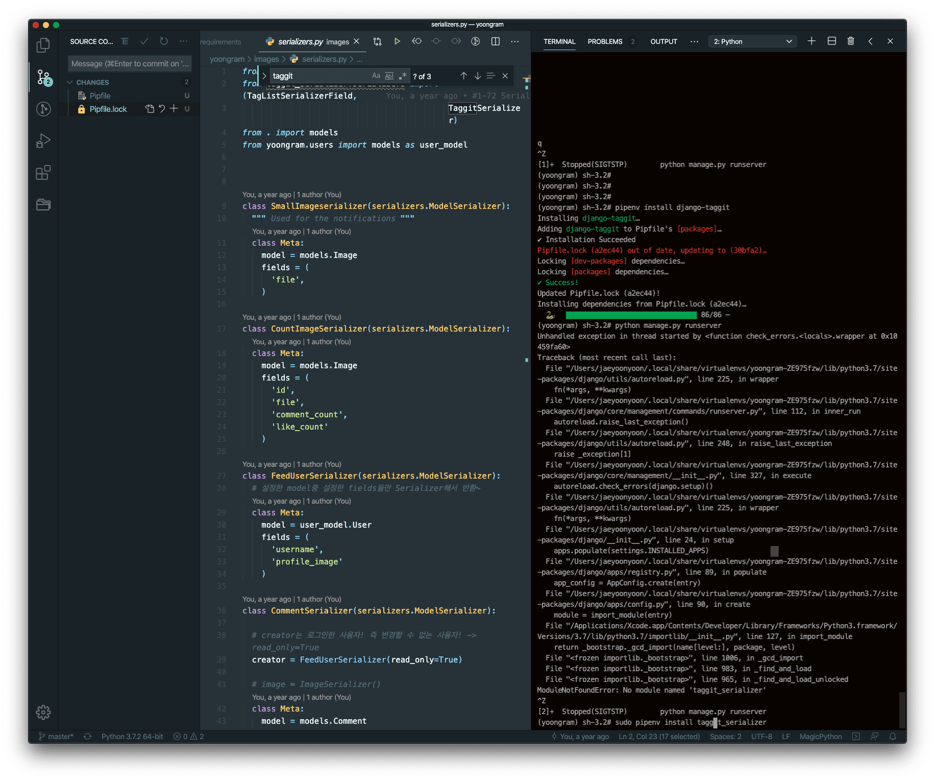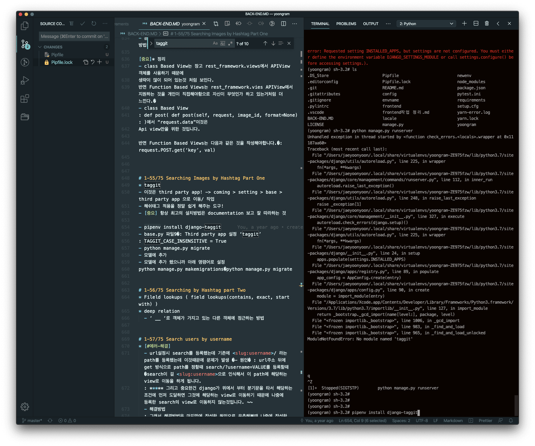 - THIRDPARTYAPPS에 설치 안된것 설치 Python manage.py runserver 하니 THIRDPARTYAPPS에 설치가 안된것들이 있어서 설치 위에 두개 "taggit , taggit_serializer" 설치