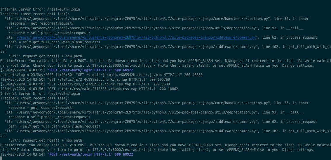 RuntimeError: You called this URL via POST, but the URL doesn't end in a slash and you have APPENDSLASH set. Django can't redirect to the slash URL while maintaining POST data. Change your form to point to 127.0.0.1:8000/rest-auth/login/ (note the trailing slash), or set APPENDSLASH=False in your Django settings.